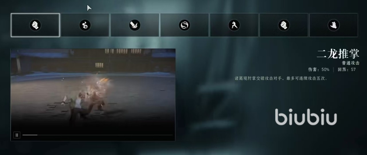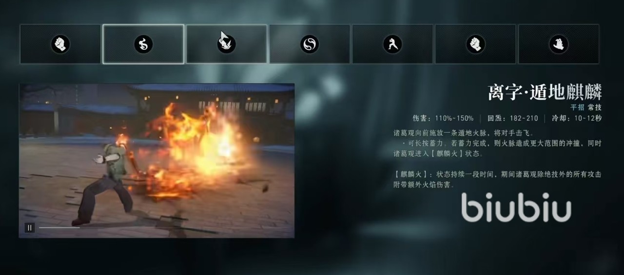 诸葛观所使出的普通攻击是二龙推掌,它以肘掌交错攻击对手,最多能连续攻击5次,这里要注意最多5次,并不是每次使用都可以打满5次,这涉及到连招和对手的防御等一系列机制。第一个技能是离字遁地麒麟,属于平招,诸葛观向前释放一条遁地火脉,将对手击飞,该技能可以通过长按方式进行蓄力,如果等到蓄力完成后再释放,那么火脉将会造成更大范围冲撞,同时自身进入到麒麟火状态,该状态会持续一段时间。
