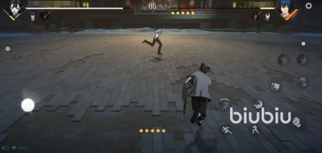 游戏战斗玩法的核心其实有点像是“剪刀-石头-布”,普攻可破除防御并转化为投技,蓝光技能(平招)可被防御但可打断普攻,红光技能(险招)无法防御,需通过闪避应对,在这个基础上加入体力系统,就有了不错的策略性。