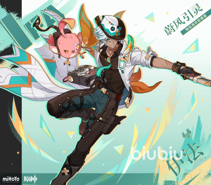 伊法是四星风系角色,他的普攻会用发起打出多段攻击,形成风元素输出值,他的战技会在释放时,让自己的宠物咔库库带着自己到空中,期间伊法可以发射出秘密药弹,对敌人造成风元素输出的同时,为所有队友恢复生命值。