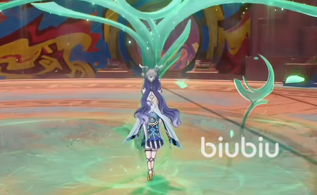 她的技能是可以对敌人造成草属性的范围伤害。在施放技能的时候玩家们需要拥有草露才可以进行施放。在施放之后将会消耗全部的草露,每消耗一个草露将会使菈乌玛获得一层月咏。