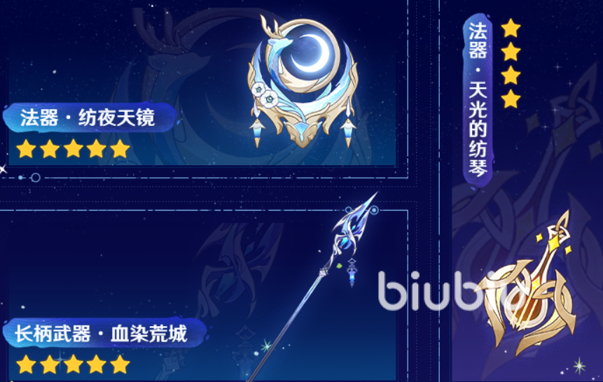 预计将加入数款与挪德卡莱元素相契合的新装备,包括7把4星可锻造武器,另有任务与活动可赢取的免费武器。有专为“月反应”设计的2套新圣遗物,一套强化暴击率与月反应伤害;另一套提升元素精通,适合支援定位。