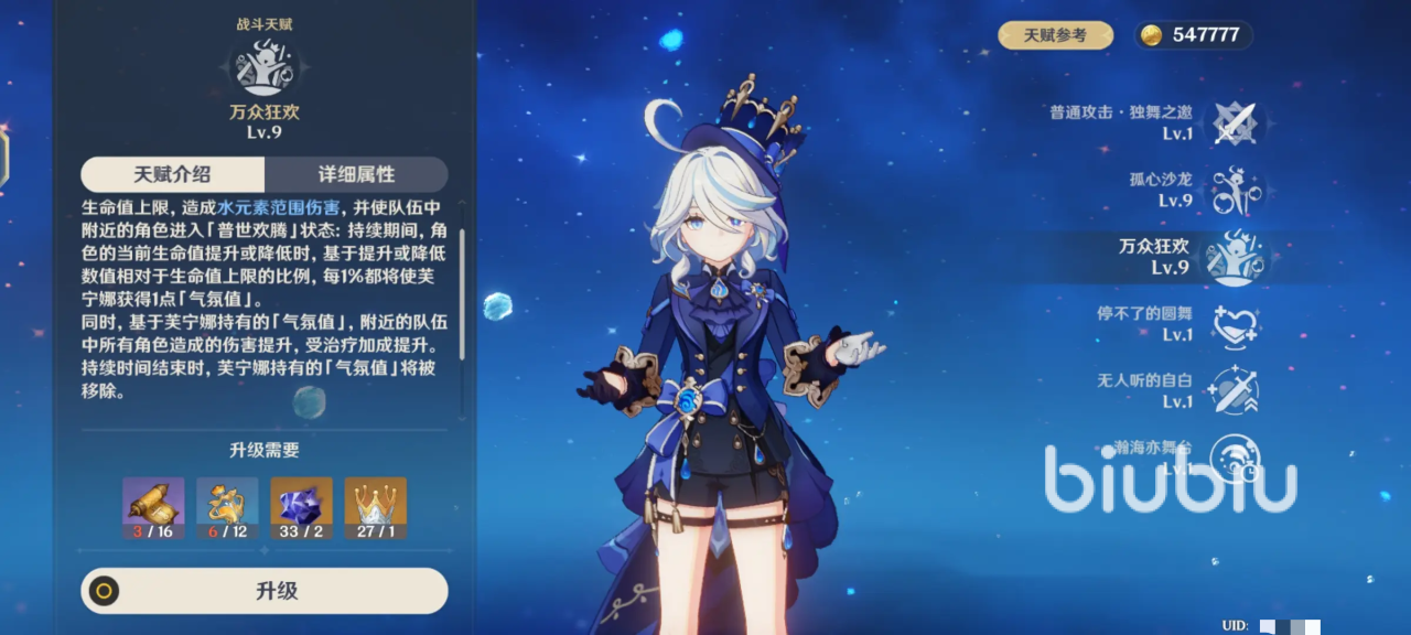 元素爆发根据生命值的波动可提高队伍整体伤害或治疗效果,作为全功能性的辅助,她不需要特定的配队,养成的成本也是比较低的,整体的培养价值非常高,在战斗中的实用性也是显而易见的,可搭配基本所有的水系队伍使用。