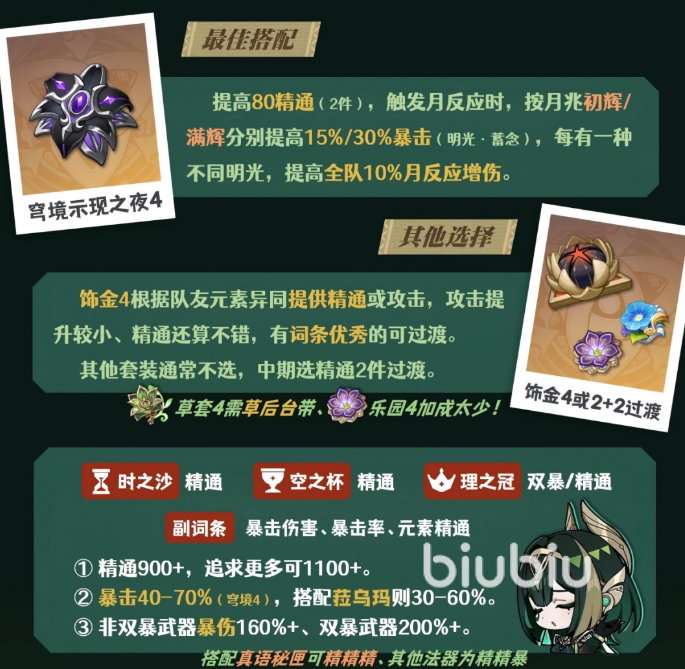 这是首选套装,两件套带来80点元素精通;四件套在队伍可触发月曜反应且奈芙尔在场时,根据队伍月兆状态提升暴击率,同时会额外增加月绽放的伤害,如果队伍拥有多种“月辉明光”效果,还可叠加伤害加成。