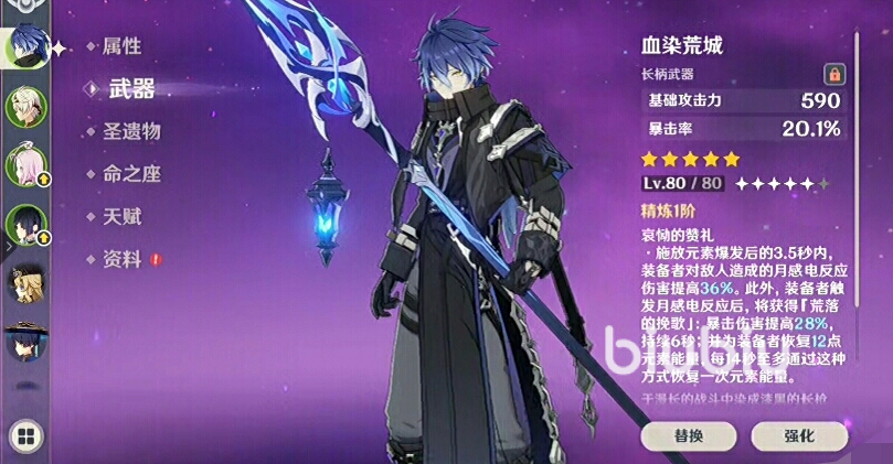 专武“血染荒城”绝对是优先选择的,能完美契合其高爆发的需求;其他可选的武器上,像赤沙之杖、支离轮光等长柄武器也是可以的,如果这些都没有,可以先去选择西风大剑或锻造武器万能钥匙、拾慧铸熔等来进行过渡。
