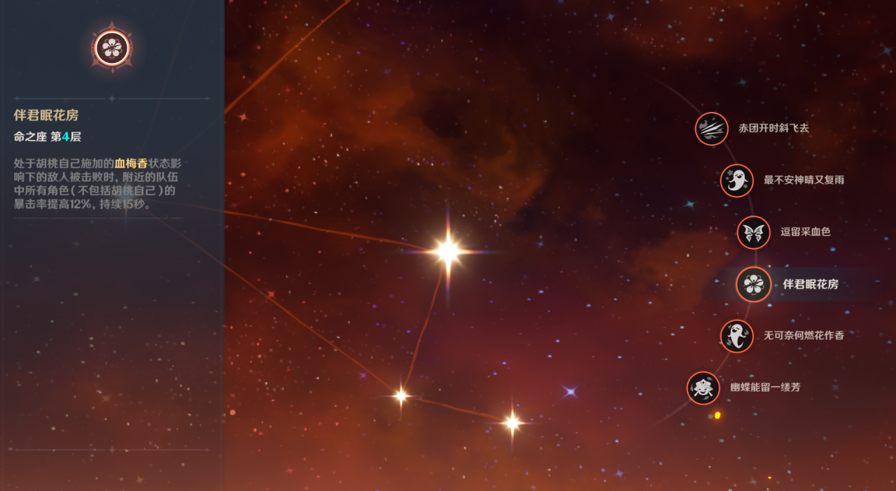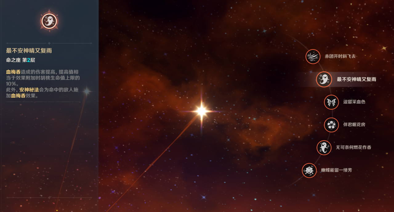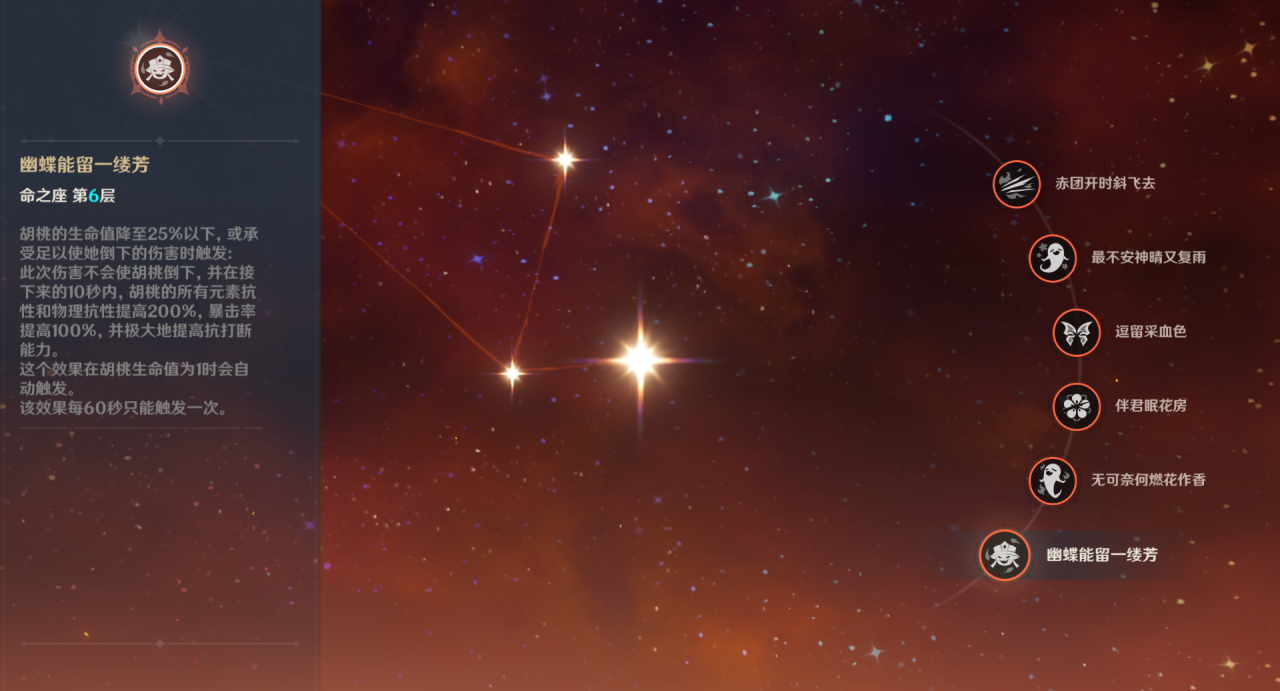 2021年03月16日 09:45 来源:小丑一个角色想要提升,命之座算是比较重要的一环。而胡桃作为一个刚推出的角色,大部分玩家都不是很了解。今天小编就带来原神胡桃命之座介绍,将详细的讲解不同等级命之座的能力并进行分析,一起来看看吧。