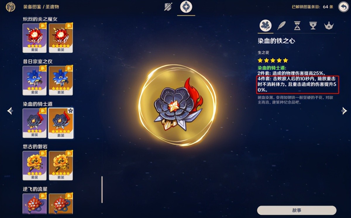圣遗物建议:染血骑士4件套,物伤杯子。染血不只带来巨额物理增伤(25%),更重要的是4件套特效:消灭对手后10秒内猛击不用耗体力且伤害提高50%!(都是超数字)