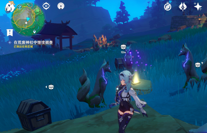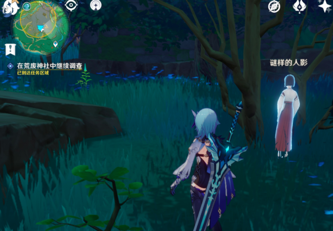 2. 任务开始后,要在荒废神社里调查,找到3名式神。式神就是飘在图上的谜样人影。