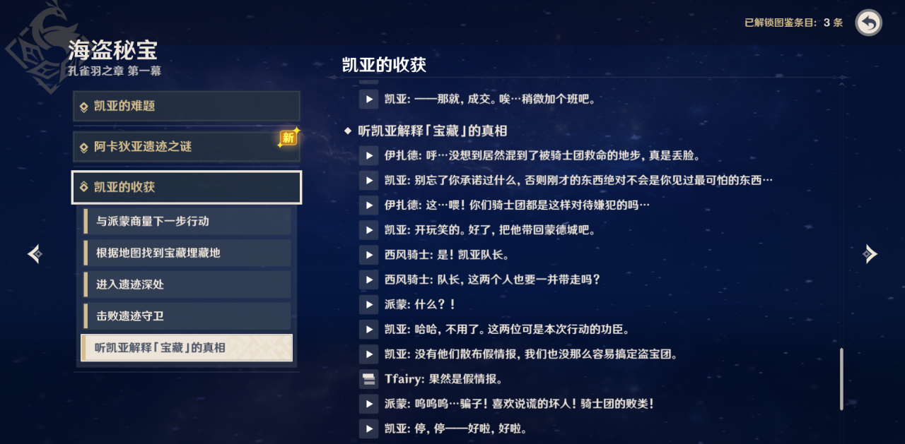 最后,游戏中是存在一个稳定获取黎明剑的方法的,那就是完成角色凯亚的传说任务“孔雀羽之章-第一幕”。该传说任务会要求我们寻找海盗的宝藏,跟随凯亚完成该任务后玩家会得知所谓的宝藏不过是噱头,不过凯亚仍然会奖励大家一把黎明剑。