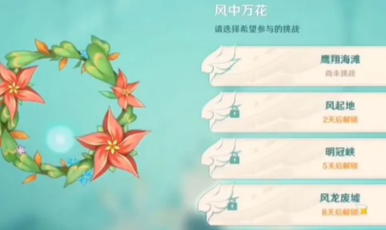 三项活动,一项是“风中万花”,一项是“百发百中”,一项是“风声”。风中万花是一款高空飞行的游戏,玩家可以在空中自由落体,在空中可以获得大量的花环,获得花环可以获得相应的积分。