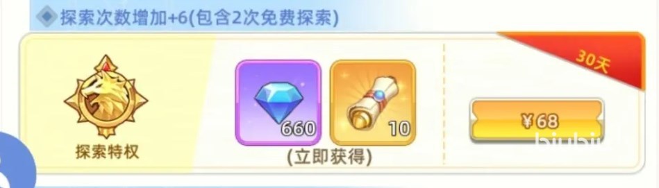 如果是月卡玩家,“大月卡”加“探索权益”这2个必买,同样白嫖的阿瑞斯作为主C来养,搭配活动送的1个可以升星。其他角色也有用,5星建议留着,尤其是在前期得到的5星会很多,把精炼度提上去也是会比一些普通SSR要能提供更强的战力。