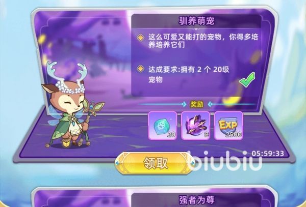 它们主要分为两个类型,主要就是角色和宠物两个方面的,领取任务之后达成目标,它后面会出现一个绿色的勾,代表大家已经完成任务了,可以直接领取奖励。参与该玩法有可能获得角色哦,一般来说它下面会出现三个角色来给大家进行选择,要是其中角色为灰色状态的话,就代表大家还未拥有该角色,可以进行获取一下。