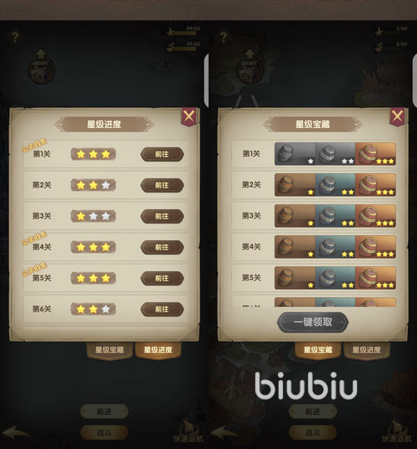 星级解锁说的是给在这里将敌人并达到了相应的条件就会解锁的东西,每次只会将各位解锁的最高级记录下来,不同的级别都能够分别获取一份奖励,其中三星的条件要全部一起完成才可以,各位能够在快速返航这里看到每个地方相应的星级进度,这样就能将相应的关卡的宝藏打开,并且还能够通过这个功能前往指定的关卡,然后可以再次进行挑战,一次获取更高的星级。