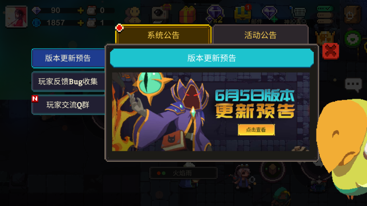 1、系统公告:系统公告主要分为三大类版本更新预告、玩家反馈Bug收集、玩家交流Q群,点击可以查看公告详情。