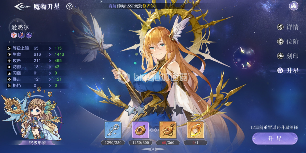 事实上当玩家抽到多余的魔物后,系统会自动将其转化为再遇之缘、白银钥匙和魔物同名碎片,消耗这些材料再加上金币即可对魔物进行升星。升星可以增加魔物的生命、防御和攻击等全属性,并且还能增加奥义技等技能的等级。