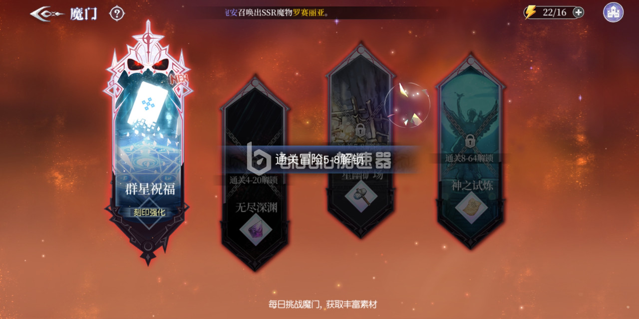 魔门挑战是游戏中的资源模式,分为群星祝福、无尽深渊、星幽矿场和神之试炼四种关卡,每个关卡的通关技巧不同,如星幽矿场适合用群攻法师打、无尽深渊适合用高伤骑士过,此时玩家多余的魔物就能派上用场啦!