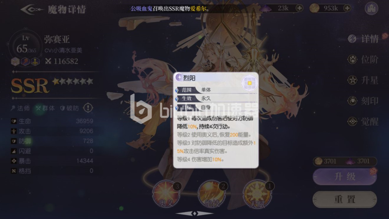 太阳女神弥赛亚是SSR级别的魔物角色,属于高爆发法师,具有全场最高的9宫格群体伤害技能,被动技能具有降低敌方防御,并且提供真伤的作用,是团队当中适合先手的角色,缺点在于身板比较弱,而且技能施放间隔比较长,没有倍率伤害,这样就必须要有辅助角色给她增加能力回复,需要搭配真伤奶妈或者连击奶妈。