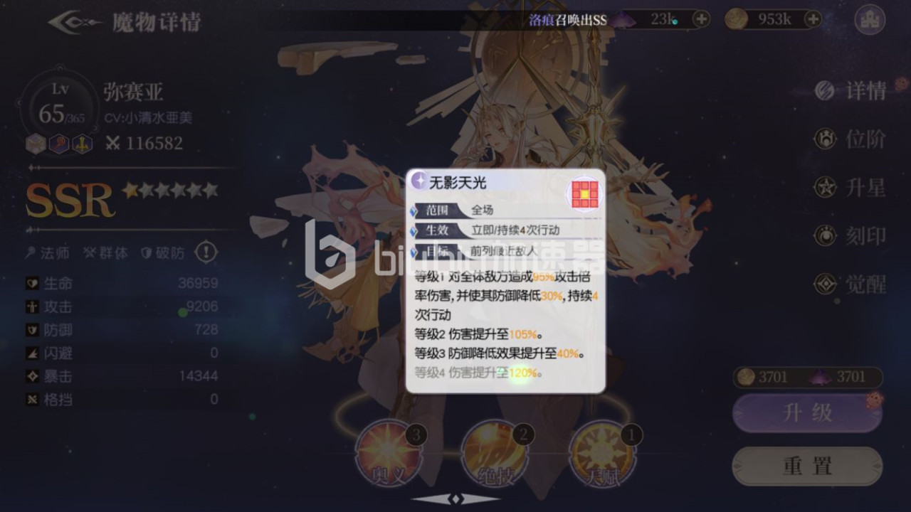 奥义无影天光,范围全场,对对方全体造成95%的倍率伤害,并使其防御下降30%持续4次行动。这个就是弥赛亚的核心技能,单从倍率伤害上面看不高,这个就要求弥赛亚自身的法术攻击需要很高,这样在培养方面如果没有绝对的资源优势是不能打出伤害的,因此弥赛亚是一个非常吃资源的角色,如果当主C来培养就需要花大价钱,而且要配几个辅助围绕她才能打出伤害。