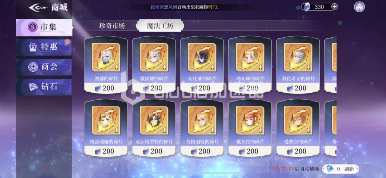 在升星界面我们可以看到,大部分升星材料主要是钥匙、再遇之缘和魔物碎片。这里的资源都可以通过祭坛召唤来获得,钥匙可以通过完成日常任务,参与活动获得,魔物碎片和再遇之缘,也可以通过挑战各类迷宫获得,另外魔法工坊的市集也可以购买到魔物碎片,需要花费一定的核心碎片。