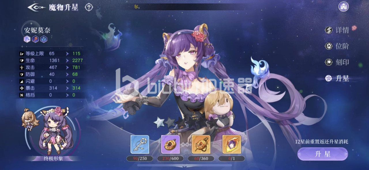 具体升星方法是在主界面点击队伍,进入队伍面板找到想要升星的魔物角色点击进入(如果不在队伍当中的魔物可以在右下角魔物界面内找到对应魔物进行升星),点击进入人物界面右边栏找到升星,在这里我们可以看到对应的升星所需要的材料,当我们的材料齐全的时候就可以进行升星了,点击升星即可完成升星,12星前重置会反而升星消耗的材料。