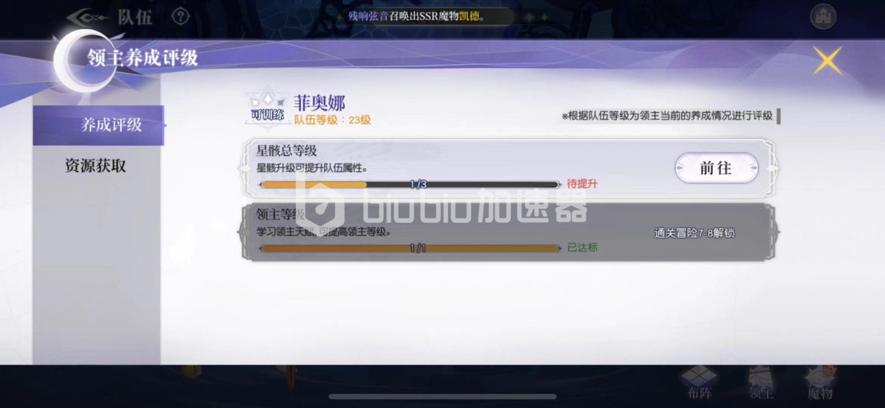 在游戏中我们可以在主界面中找到队伍选项,点击进入,在这里我们可以看到领主和魔物的具体情况,队伍中显示了主力的魔物和领主,系统会根据玩家队伍等级,给领主和魔物做一个养成评价,评级分为3个档子:急需训练、可训练、训练极佳。当评价处于急需训练的时候就说明队伍战斗力已经跟不上需要挑战的关卡了,必须马上开始升级,点击评级就可以看到现在缺的是哪一方面的提高,我们在领主等级这里点击评级,就可以看到对应的提高领主等级的方法,在通过冒险7-8之后可以解锁天赋,领主在学习天赋之后可以提高领主等级。