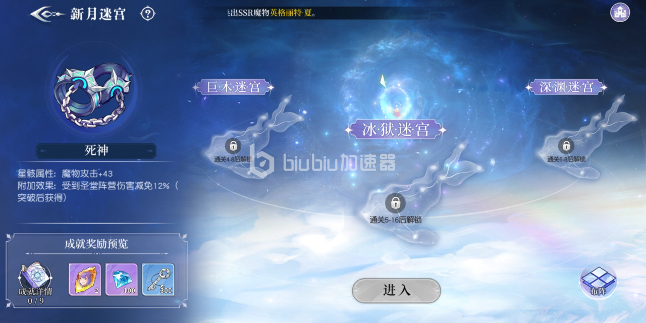 2021年08月09日 15:25 来源:李长寿冰狱迷宫需要通关主线5-16才能解锁,并且该迷宫难度很大,还有三种不同结局。在本期月神的迷宫冰狱迷宫攻略中,小编就来介绍冰狱迷宫的规则说明、阵容推荐、buff选择与奖励概览,保证可以轻松通关哦!