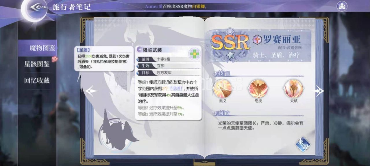 在露西卡和罗塞丽亚中,最大的特点是治疗的同时可以附加圣盾效果,罗塞丽亚的天赋是在开场为攻击最高的角色附加圣盾,露西卡在退场的时候,为全体施加圣盾。其他的治疗技能也都是附带圣盾效果,被圣盾保护的角色,获得一次伤害减免,圣盾是可以叠加再一次的。露西卡是为前方的友军治疗,而罗塞丽亚是治疗后方的角色,这两个治疗需要在位置上注意一下。