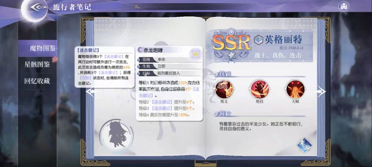 英格丽特擅长的是真实伤害,月神的迷宫中的真实伤害是无视对方的一起防御效果的,所以是所有输出效果中最高的。英格丽特的真实伤害来自奥义技能赤龙咆哮和绝技崩山爪击,其中赤龙咆哮的效果是巨额的单体真实伤害,并且自身获得连击徽记。连击徽记是英格丽特的另一个输出来源,英格丽特每获得三个连击徽记,就能在出手之后,额外攻击一次,同时这三个连击徽记会清除。