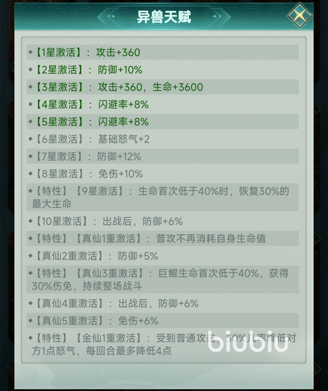 异兽阵容的选择上如果选择合适的异兽,还能触发异兽共鸣,能和巨鲲共鸣的异兽是青龙、玄武、白虎等,这样的话队伍攻击能力更强,要是队伍中在加一个朱雀和腾蛇就是主流的荒兽队,不管是pve还是pvp下都有很好的对战效果。