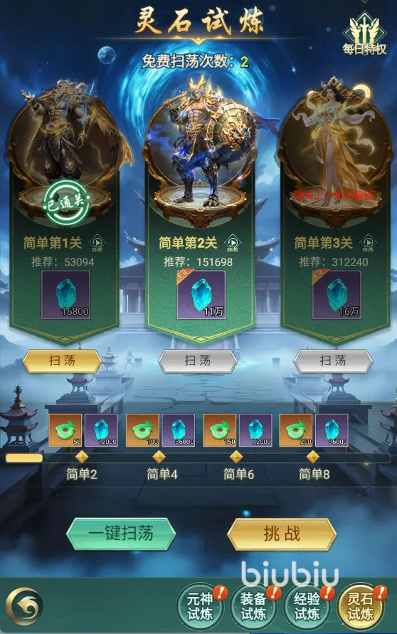 接着再来讲一下基本玩法,这是个分类明确且难度递进的副本。大家可根据自身所需要的资源去挑战不同副本,比如缺经验道具就要挑战经验试炼了。另外三个副本就是元神、装备、灵石,只要大家成功挑战一个关卡后就会自动解锁下一关。
