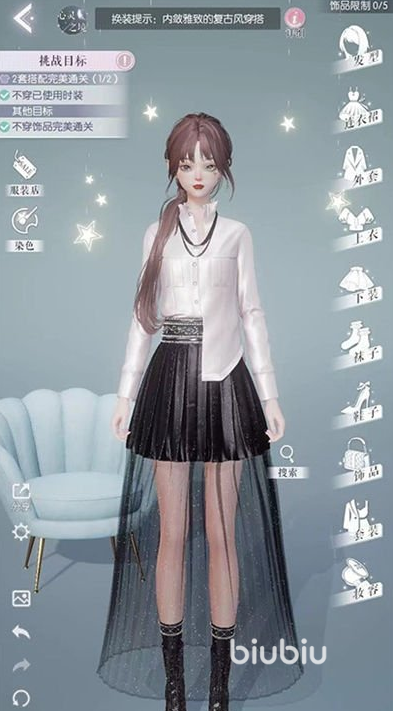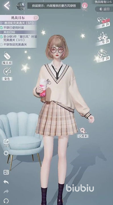 这一关卡的通关条件就是洛丽塔风,玩家们只需要穿戴连衣裙就可以了,换装提示是内敛雅致的复古风穿搭,玩家们可以至少穿三件拥有复古风标签的服饰,而且也不能佩戴任何饰品,这样才能完美通关。玩家们可以选择学院风的衣服,而且最好是带一个眼镜,这个眼镜虽然算饰品里面的,但是可以帮助玩家们更好的提升评分。我们现在讲究的就是怎么通过,而并非提高分数,玩家们如果没有更多好的套装之前一定要搭配眼镜。