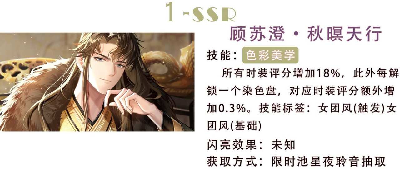 秋暝天行是专属于顾苏澄的一个技能向卡牌,可以为我们展现一段非常炫酷的古风剧情场景,主角自然是我们自己与霸总顾苏澄啦,玩家们在获取这个卡牌之后可以线观看剧情,观看完成可以提升与顾苏澄的亲密好感度,为之后的攻略提供了基础。