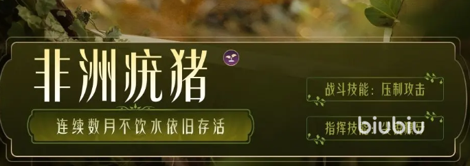 以上就是野兽领主新世界非洲疣猪的介绍,整体来看它是一个十分不错的野兽,有指挥技能可以帮助玩家攻占领地,它还拥有很强的生存能力不用太过操心,最后也是非常推荐玩家们去选择它。