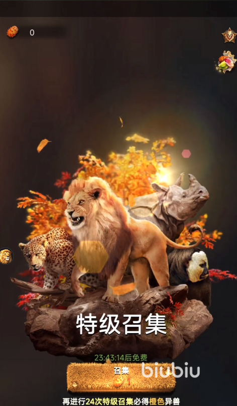 在异兽召集页面上,卡池分为高级召集、普通召集与活动召集。其中普通召集卡池每天有一次免费抽取的机会,消耗之后可以使用道具普通异兽诱饵抽取,消耗与比例是1:1。想招来更加稀有的大型动物,则需要进入高级召集卡池,消费钻石购买高级异兽诱饵,有机会抽取草原狮。每个高级异兽诱饵价值150钻,可以单抽,也可以一次性消耗10个资源进行10连。每在一个卡池里累积抽取30次,保底一个橙色异兽,如果在30抽之前出货,保底次数就会重新计算。