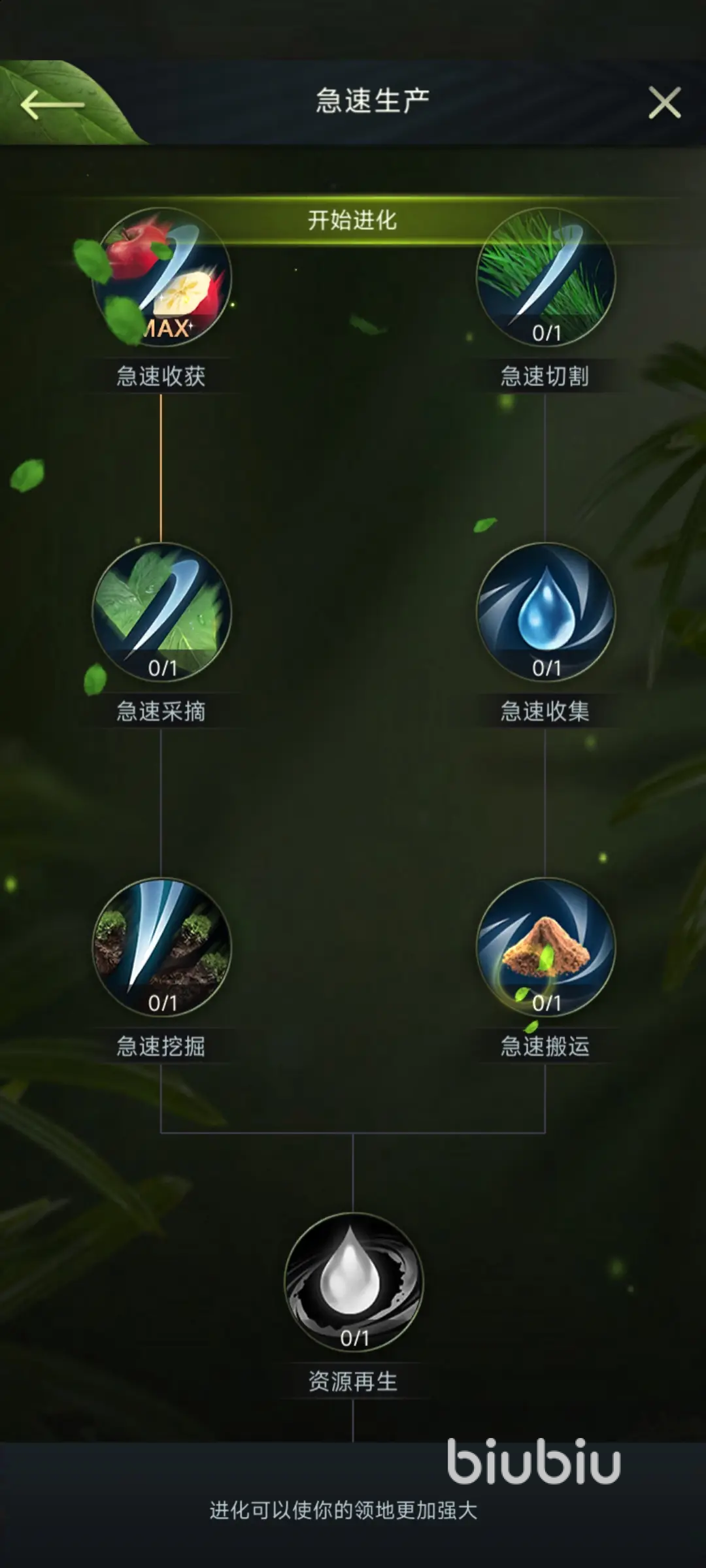 那么领地建设初期的时候,资源就是关键所在。树叶是不可缺少的资源,树叶可以通过两种建筑获得,一个是树叶采集地,另一个就是树叶存放地,采集地可以收集属性,建筑等级提升还可以提高产量,存放地主要是用来存在树叶的,升级之后存储的上限也会提升。第二种重要资源是水,采集了狐猴树叶后,可以去露水水机池当中收集露水,露水是维系领地水资源的重要来源,建造和升级也要及时。