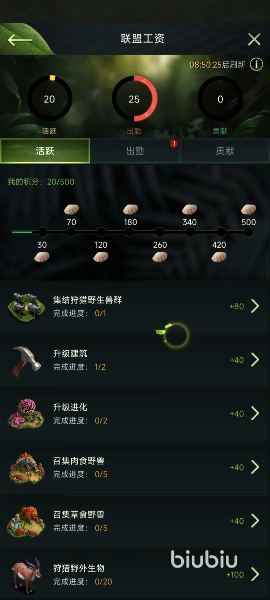 “联盟进化”当中有一个每日捐献,在其中可以对联盟进行加强,而且还能够得到联盟贡献,这个贡献值是可以在联盟商城里面购买物品的,比如加速,迁徙,保护罩等等有效道具都是可以购买的;连门里面除了福利,还有每日丰厚的工资之外,甚至还有联盟礼物可以获取,能够轻松的得到很多物品;而且联盟内的官员还能得到额外的资源;还可以集结盟友对兽群发起进攻,击败兽群还可得到大量的奖励。