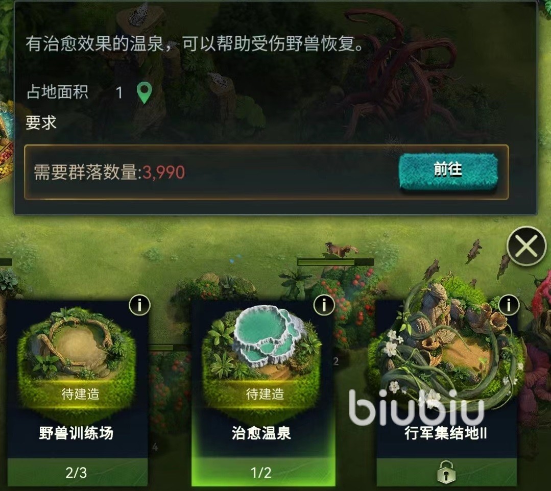还有一些与战斗相关,例如野兽训练场,是野兽进行日常训练的场所,物资充沛的训练场可大幅提升召集野兽速度和数量。还有治愈温泉,战斗中受伤的野兽可以在这里进行治疗,行军集结地,为野兽提供集结场所,为探索未知区域做好准备。