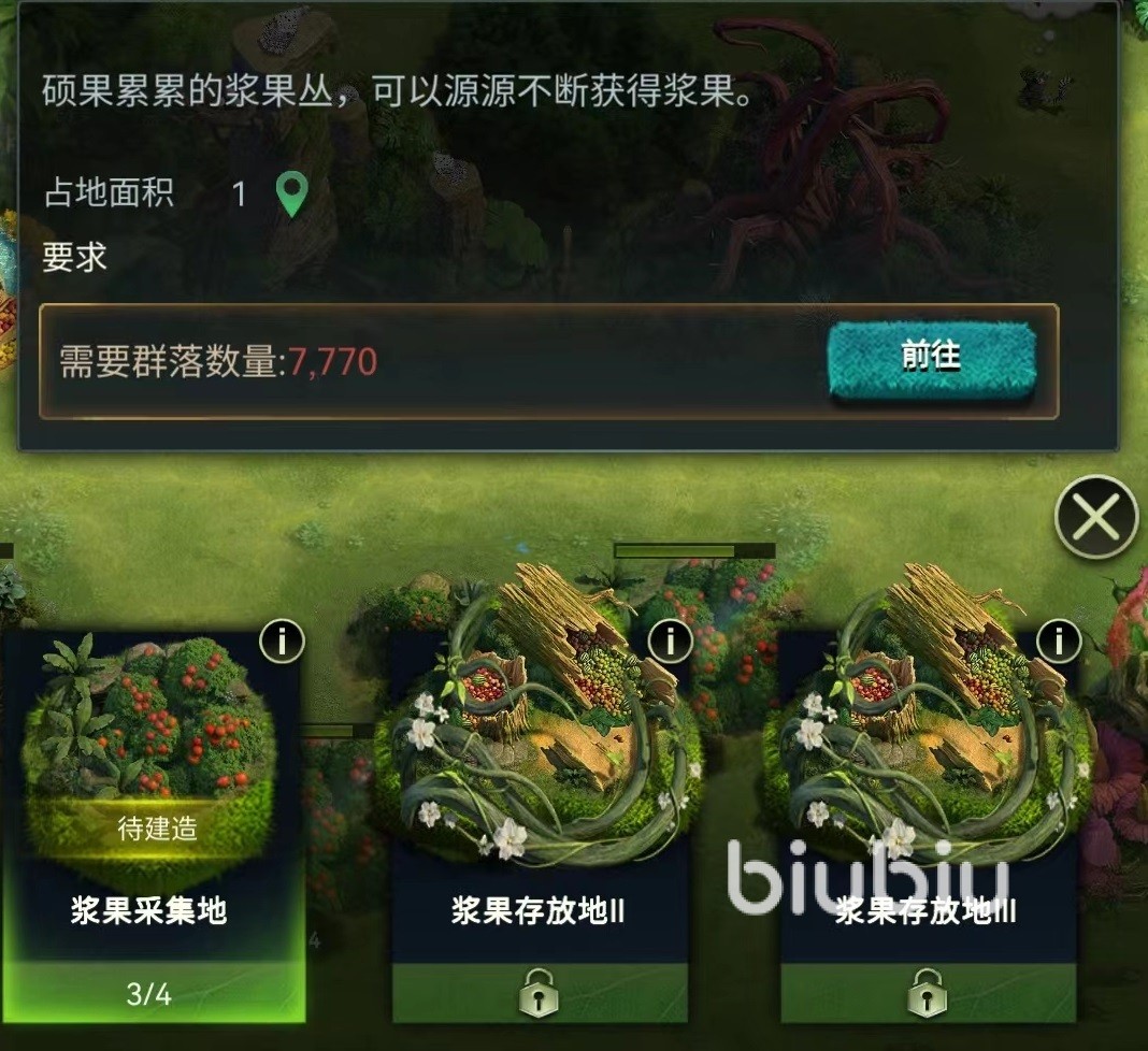 游戏中的建筑都对应相应资源,例如浆果、草、树叶、湿土、沙子、水以及蜂蜜等,都有对应生产和储存建筑。以浆果为例,浆果采集和生产需要建造浆果采集地,源源不断地获得浆果,与之对应的还需要建立好存放地,存放地的作用是用于储存,供应领地发展。其他类型草、树叶等都是如此,大家可以根据实际领地扩展和需求去适当添加建筑以及进行升级。