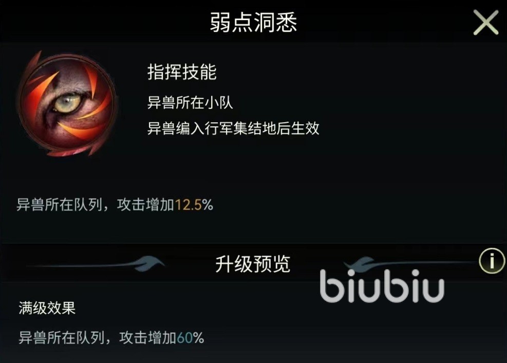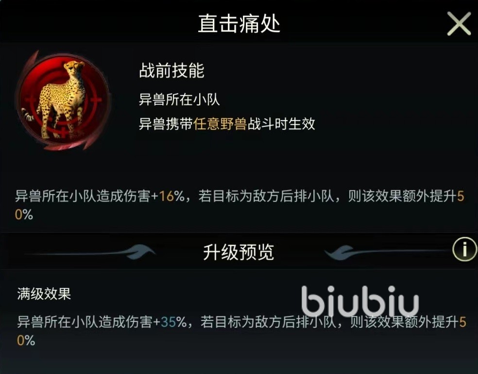 第2个欺软怕硬,同样是锁定敌方存活的最后一排小队生效,有百分之五十几率造成320%的伤害,同时附加破甲效果。该效果能够降低对方30%防御,持续两个回合。第三个直击痛处,该技能属于战前技能类型,提高异兽所在小队造成的35%伤害,如果输出目标为敌方后排小队,该效果还能再提升50%。从这些技能中不难看出,将猎豹塑造成了一名很出色的后排杀手,非常适合直接突袭对方后排,如果对方血量比较低,甚至可以直接利用高伤害去秒掉。