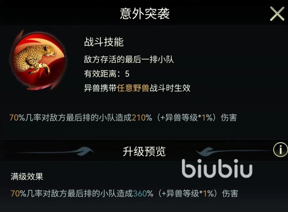 猎豹在游戏中的定位和黑豹、雪豹有所不同,它是属于通用类型的战斗异兽,能适用各种场合,所以搭配兵种时候会很方便。自身也拥有三个伤害类技能,分别是意外突袭,欺软怕硬和直击痛处。意外突袭效果是选择敌方最后排小队造成伤害,达到满级时伤害比例为360%,当然此技能也存在一定的有效距离5格。