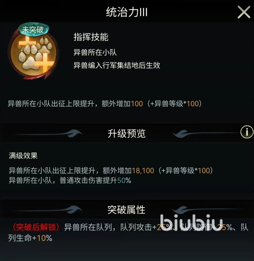花豹虽然是战斗宠物,但它属于通用类型。意味着这样的异兽可以适应各种场合,无论率领杂食、肉食还是食草,都能发挥出技能的所有效果,这在搭配中是很有优势的。先来看一下自身统治力技能,因为属于通用类型,所以小队成员都可以享受到队列攻击增加,队列防御增加和生命值增加等优势。