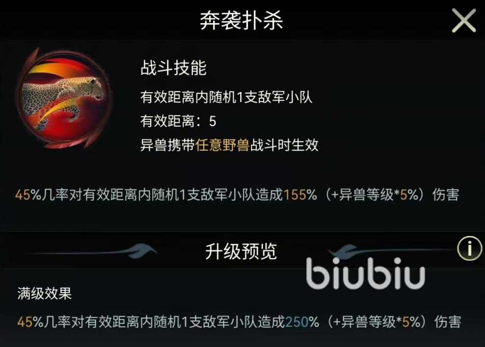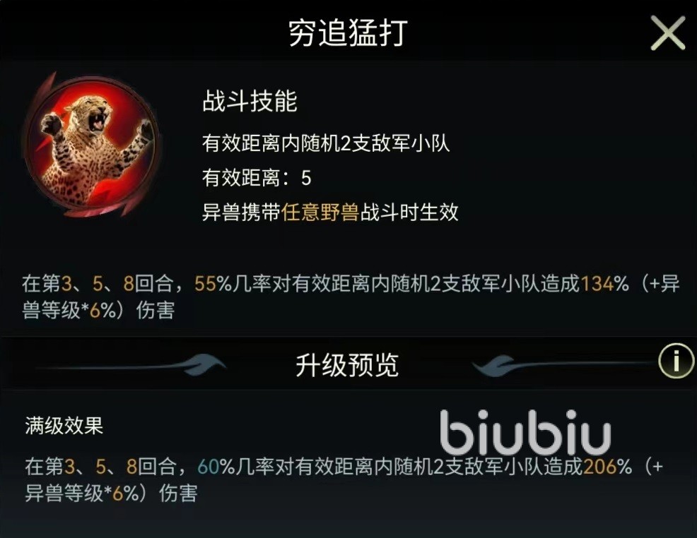 除此之外,还具有高级防御和高级攻击这两个通用类型加成技能,使得所在小队攻击和防御都能增加55%,这样的加成数值比其他的专用异兽要低一些,但容易搭配。还有一个技能冷血猎手,所有异兽都能生效,增加50%攻击。自身还有三个直接伤害类型的技能,第1个奔袭扑杀,5格有效距离,携带任意野兽战斗都能生效,有百分之四十五几率对随机一个敌方小队造成伤害。