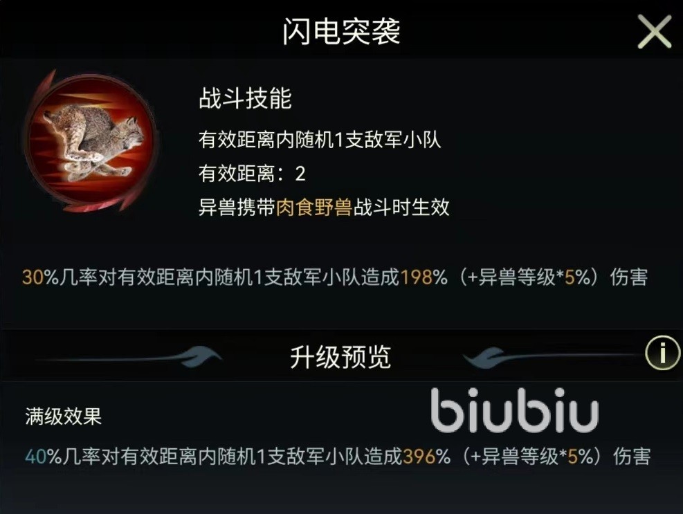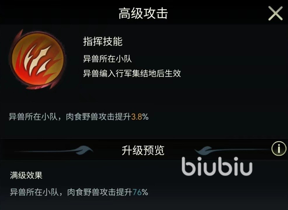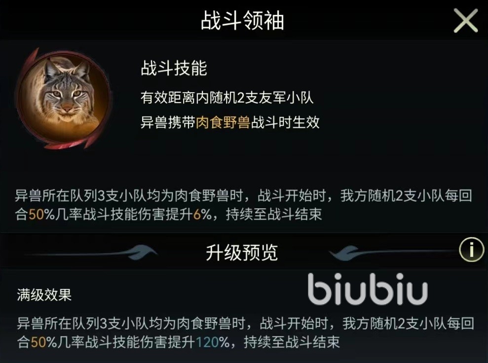 第3个技能战斗领袖,效果是为所在队列的三支小队都为肉食野兽就可以生效,战斗开始时为随机两支小队附加战斗技能伤害效果,该增幅效果一直能持续到战斗结束。这样在整体搭配的时候,可以选择其他同样的肉食异兽组成队伍,例如白孟加拉虎等就很合适,都有很强的输出能力。