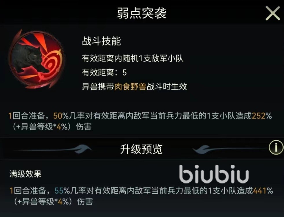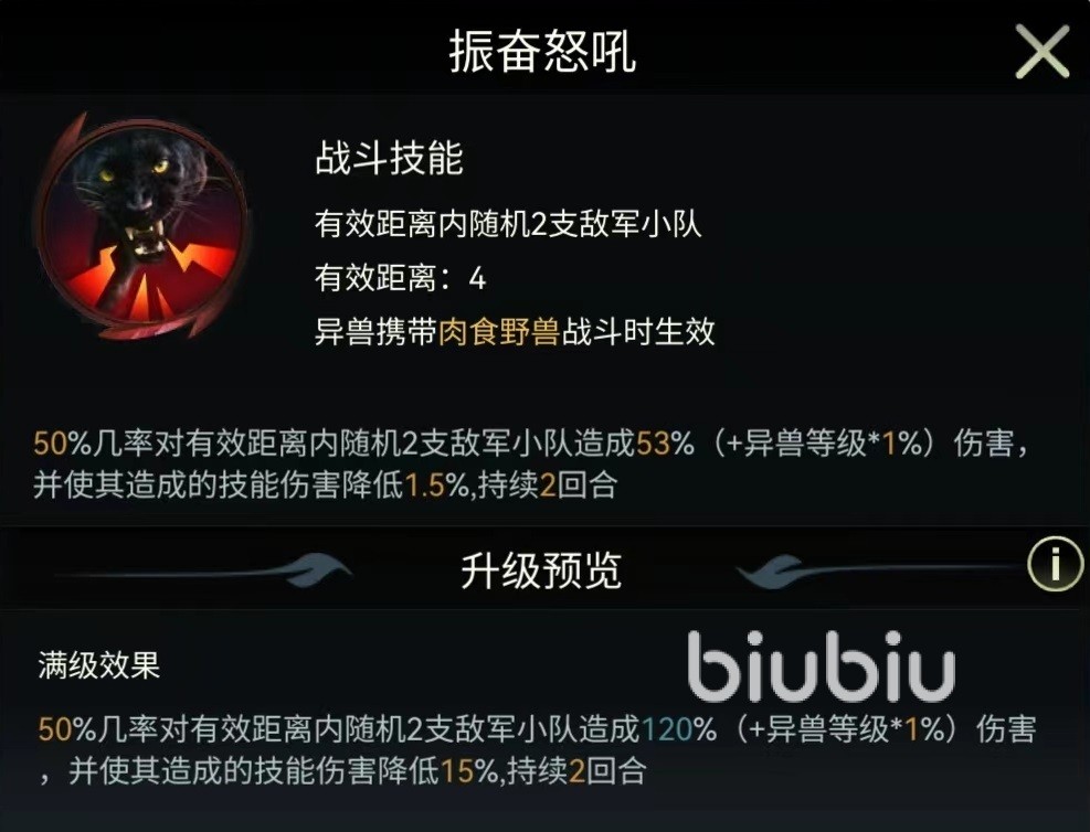 先来看一下这三个输出技能,弱点突袭施法范围比较远,五格有效距离,技能需要有一回合准备时间,有55%几率对敌方当前兵力最低的一支小队造成高额伤害,该技能可以起到有效的点杀,对方残血很难躲过突袭。振奋怒吼,有效距离为四格,在达到满级时,50%几率发动,对距离内随机两支敌军小队造成伤害,并使其造成的技能伤害降低15%,输出目标之后还可以降低对方伤害,这样的技能是非常有必要的,限制了对方输出。致命一击同样是五格距离,有50%几率选择兵力最低的一支小队造成伤害,使其接下来受到的技能伤害增加15%,持续两个回合。
