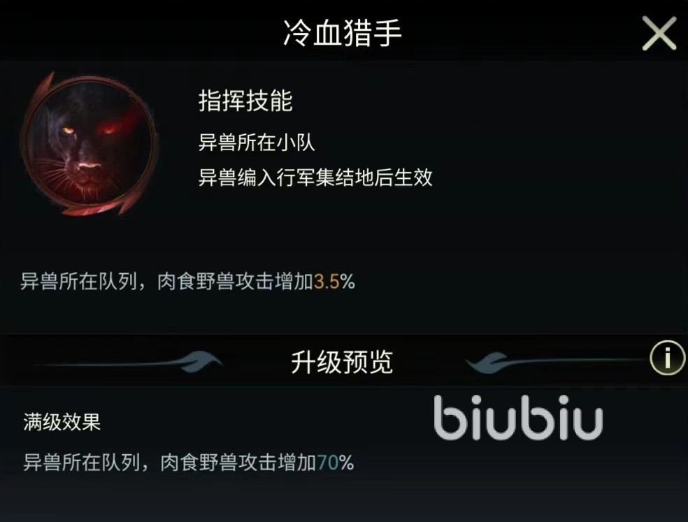 黑豹擅长率领肉食野兽类兵种,可以最大程度地发挥出自身技能特点。当统治力技能达到20级时,可以额外增加18,100点出征上限,所在小队普攻伤害也能获得提升。自身在输出方面主要有弱点突袭、这振奋怒吼和致命一击这三个技能,其他还有包括高级防御、高级攻击、群落领袖以及冷血猎手等,都是对自身小队的加成。