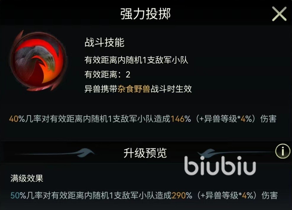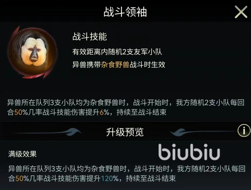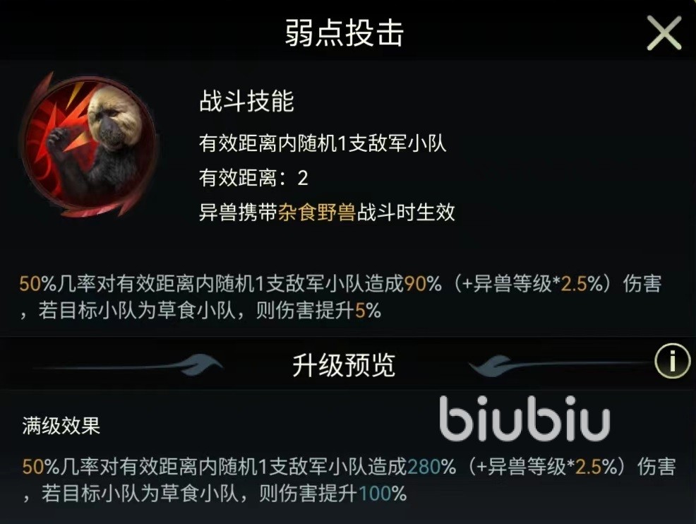 因为擅长率领杂食野兽,所以它的高级防御和高级攻击这两个技能效果,也都只有对杂食野兽才能够提升。在满达到满级时,高级防御可以提高76%防御属性,高级攻击则提升76%攻击,在提升效果方面还是非常明显的,可以显著增加战斗能力。第4个技能弱点投击,此技能升级到满级时有50%几率触发,在距离之内随机选择一支敌军小队造成高额伤害,如果攻击目标是食草属性小队,则伤害能获得100%提升。