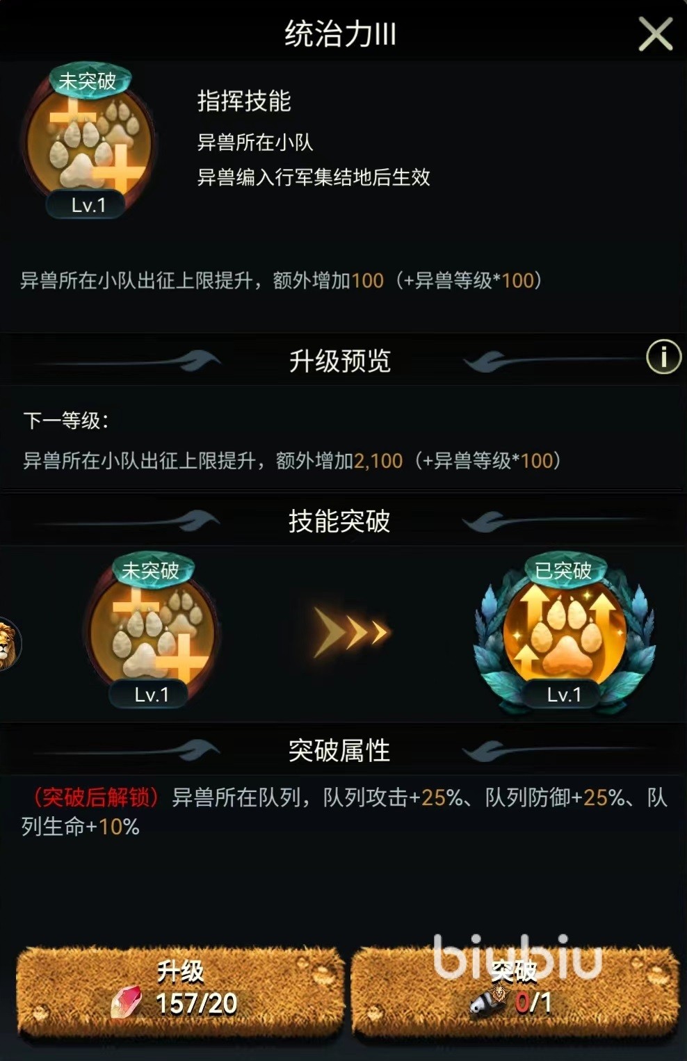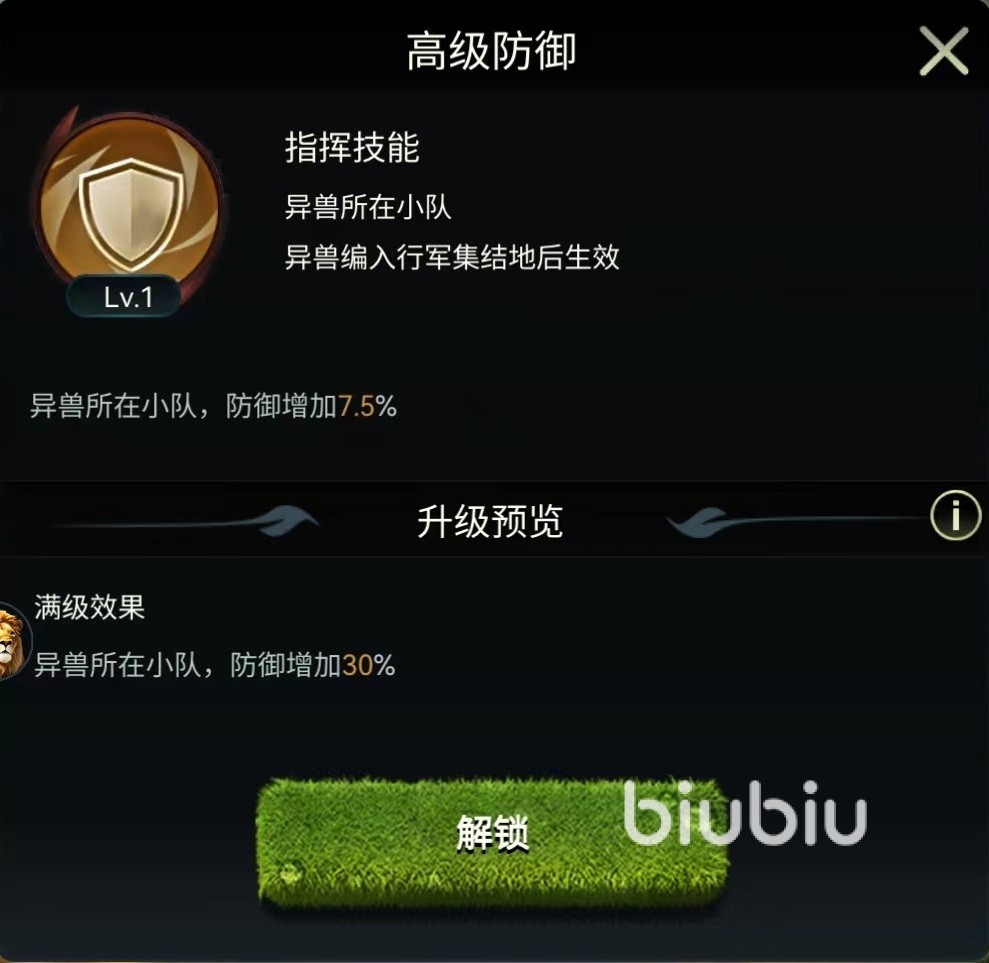 第3个高级防御,熊猫所在的小队能够大幅度提高防御属性,当升到满级时,防御最多能增加30%。第4个高级攻击,提高所在小队最多30%攻击力。第5个熊爪猛击,携带任意野兽战斗时生效,在自身的攻击距离内,随机攻击两只敌军小队,满级时有40%的几率随机造成191%伤害。第6个群落领袖,熊猫所在小队,攻击防御属性增加,入侵攻击增加,还能够提升统治力技能效果。