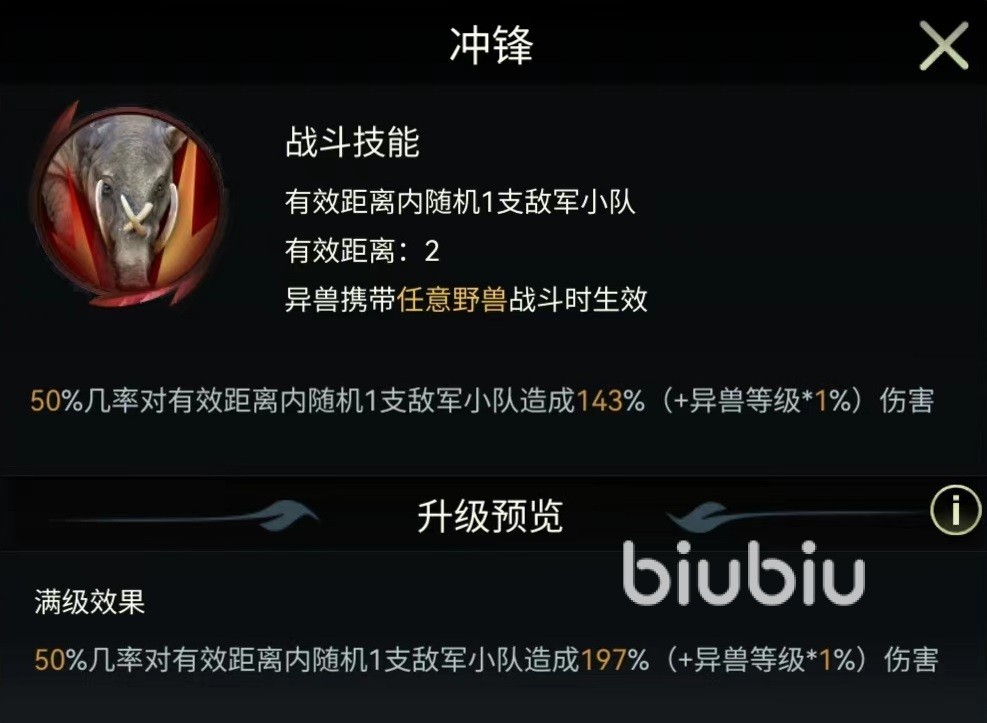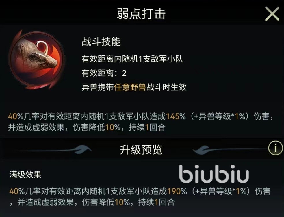 弱点打击有效距离两格,有40%几率在距离之内选择一支敌方小队造成伤害,同时附加虚弱效果,虚弱效果能降低对方10%伤害输出,持续一个回合。冲锋的有效距离也是两格,满级时有百分之五十几率随机选择一支敌军小队造成伤害,没有其他附加效果。另外还具有一些提升小队整体实力的技能,包括中级防御和中级攻击以及最后的群落领袖。终极防御和终极攻击只能在满级时增加10%防御和攻击,这样的属性相比于橙色异兽来说是非常低的,所以这一类型基本没有后续培养价值。