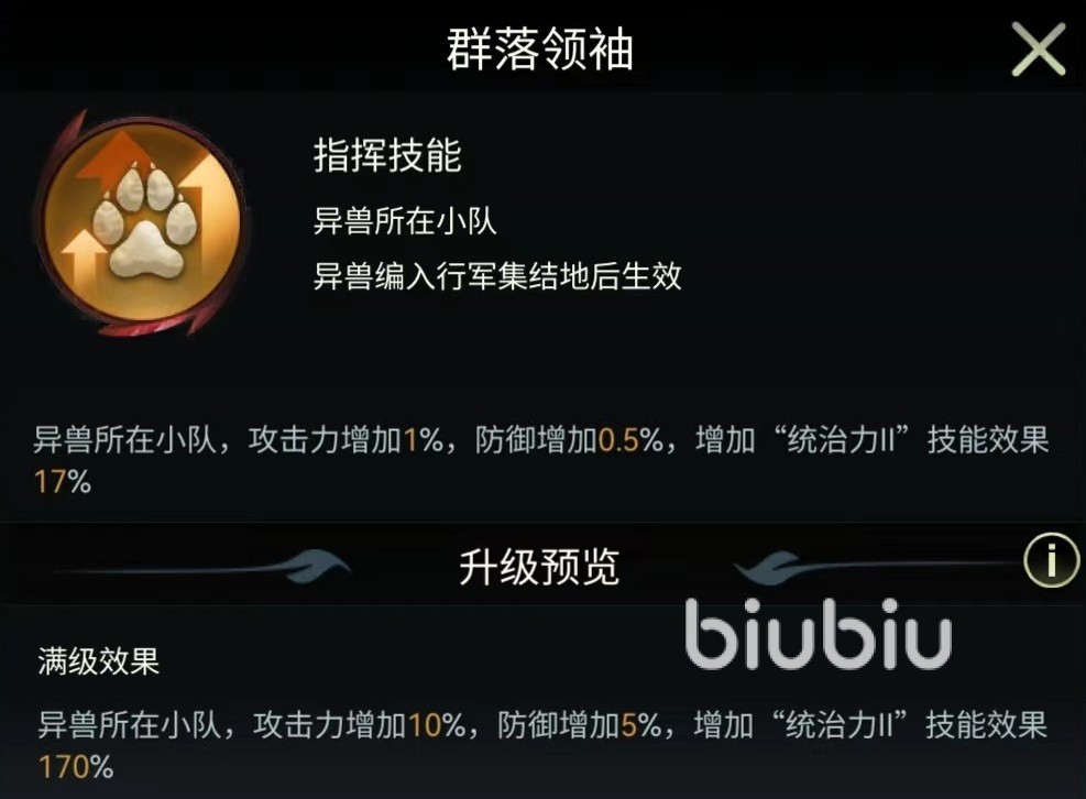 最后的群落领袖在满级时效果是增加10%攻击和5%防御,并为统治力技能进行增幅。如果大家在前期没有抽到其他的橙色通用类异兽,那么鹿豚也是可以出战的,只是大家无需向其倾注更多的资源。