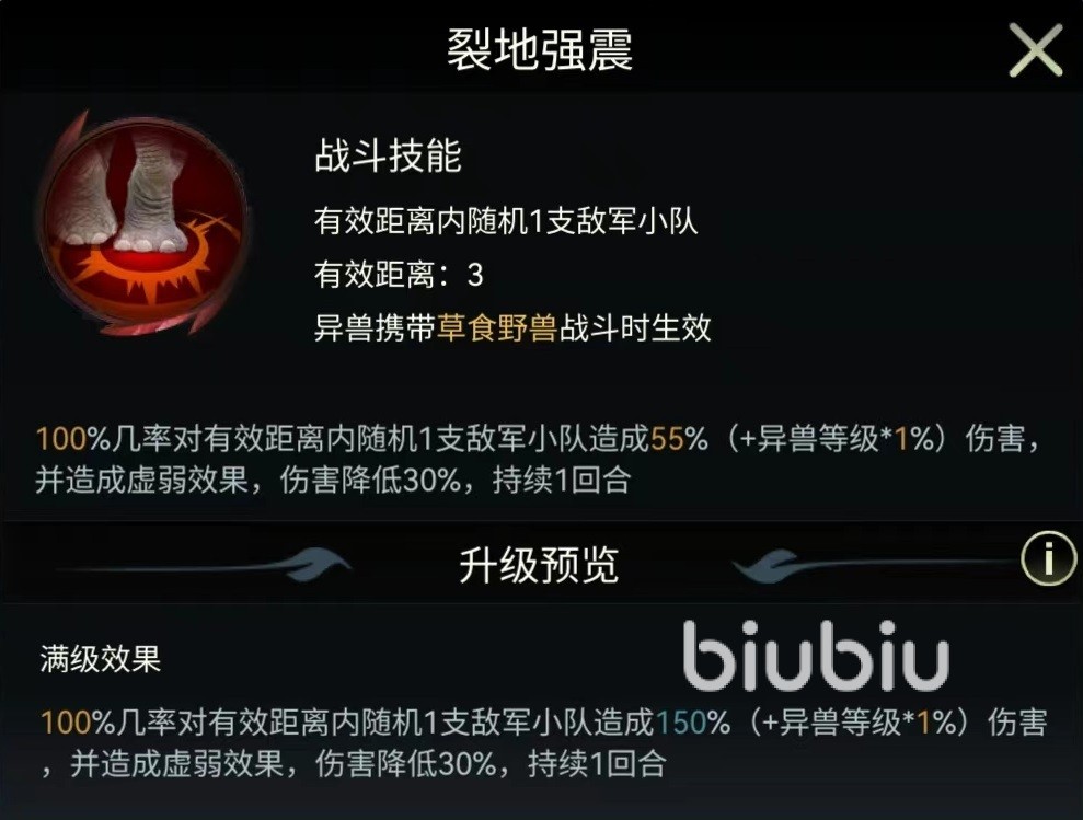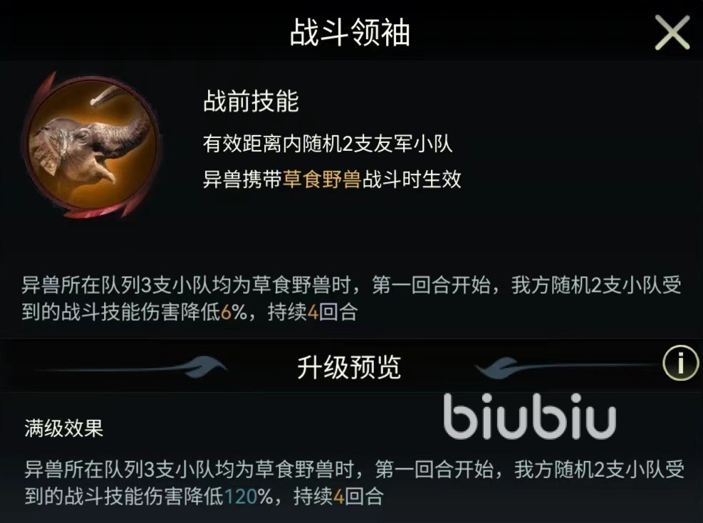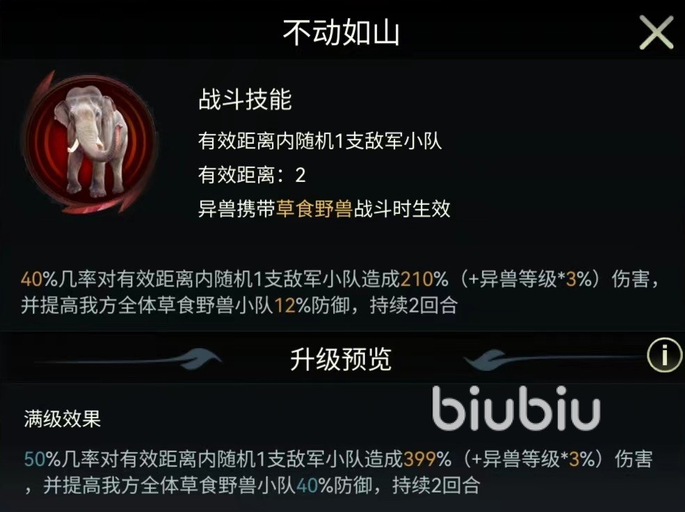 最后介绍的是印度象的三个独特技能,可以在战斗中生效,分别是裂地强震,不动如山和战斗领袖。裂地强震攻击距离为三格,有100%几率对随机一支敌方小队造成伤害,并使其陷入到虚弱状态。被虚弱之后,一个回合内输出的伤害降低30%。伤害比较一般,但是造成的虚弱可以限制对方输出。不动如山有效距离两格,有50%几率对随机目标释放,造成一次较高的伤害,并提高我高全体草食野兽40%防御属性,持续两个回合。最后的战斗领袖也是对草食类野兽生效,会随机选择两个目标降低受到的伤害。