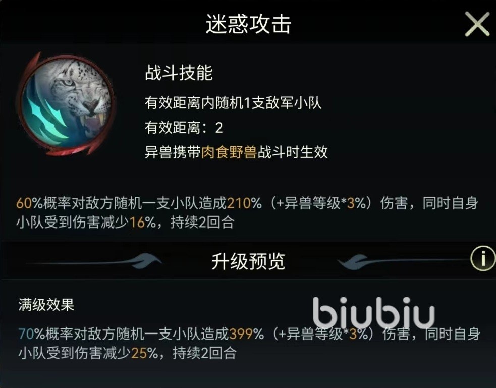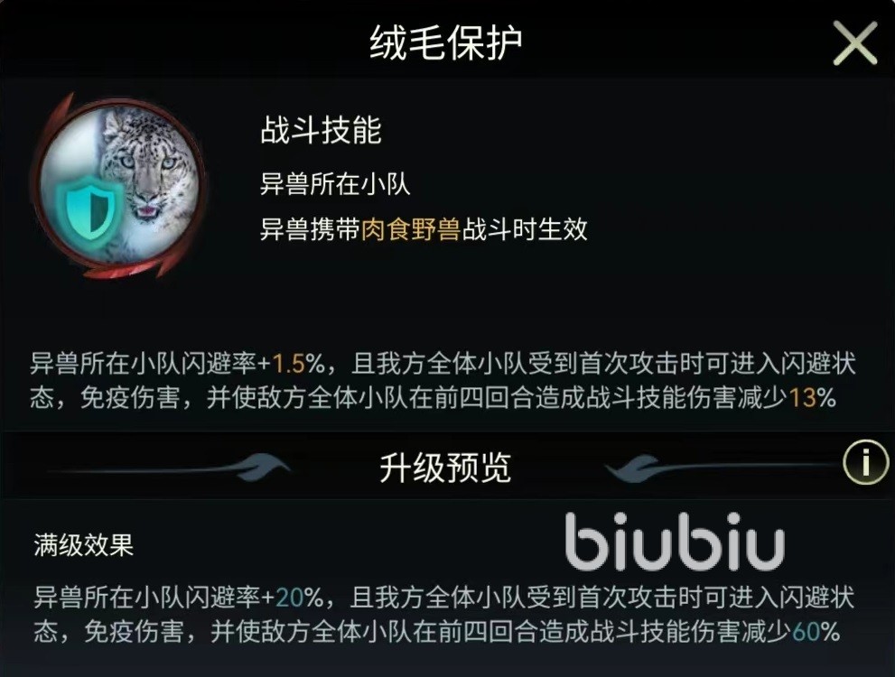 该技能可谓是非常强大,小编认为目前所有防护类技能中,雪豹的绒毛保护绝对可以称得上是前三名,可以大幅度降低对方战斗技能输出,使我方生存能力得到超强提高。迷惑攻击有两格有效距离,在满级时70%概率随机伤害敌方一个目标,造成伤害后,自身小队受到的伤害减少25%,持续两个回合。此技能既有伤害输出又有防护,实战效果非常出色。可爱外表,只对肉食野兽才会生效,最多能提升66%攻击,这样小队就不仅有了很好的防御,输出上也有着出色表现。
